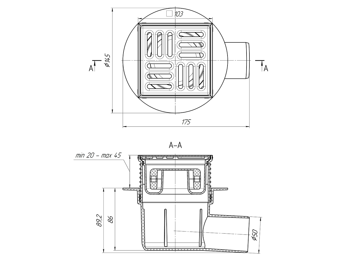 ПВХ трап СУХОЙ гориз.с НЕРЖ реш. д-50 РЕГУЛИРУЕМЫЙ 100х100(TQ5602)