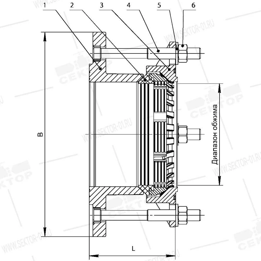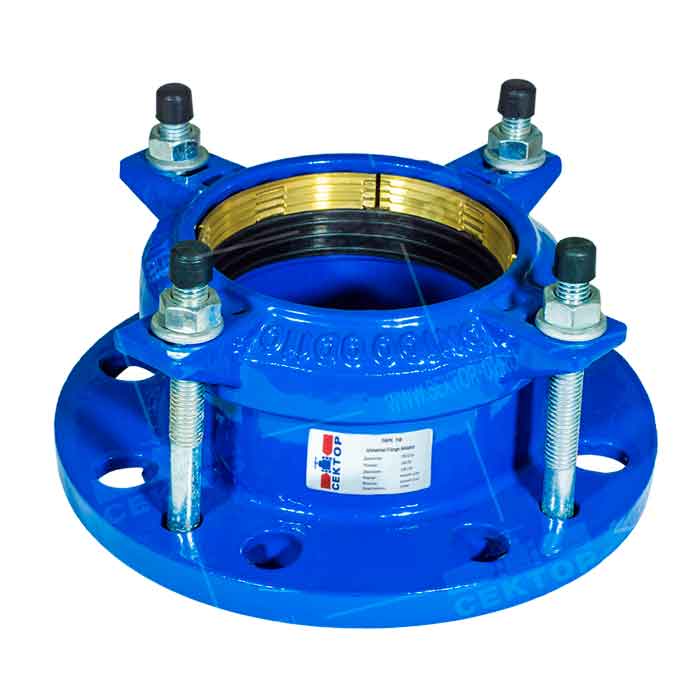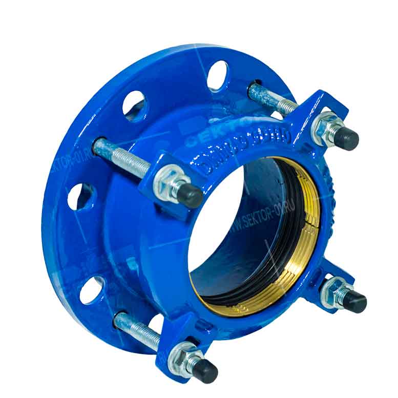 Конструктивно представляет собой чугунный цилиндр с фланцем, резьбовыми шпильками и прикрепленной ответной частью с резиновым уплотнением, и фиксирующим кольцом, выполненным из латуни для предотвращения осевого перемещения труб относительно фланцевого адаптера. Для защиты от коррозии на фланцевый адаптер нанесено эпоксидное покрытие, шпильки, гайки и шайбы оцинкованные.