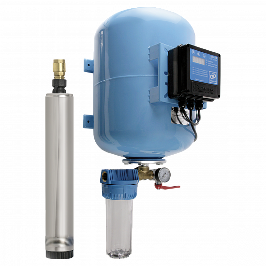 Предназначена для подачи чистой воды из скважин, колодцев и других источников. В системе установлен насос, который обладает максимальным расходом 55 литров в минуту и максимальным напором 75 метров. Он способен перекачивать воду с содержанием песка во взвешенном состоянии до 2 килограмм на кубический метр воды. Электродвигатель насоса надежно защищен от перегрева потоком омывающей его воды, что позволяет насосу работать не полностью погруженным в воду.