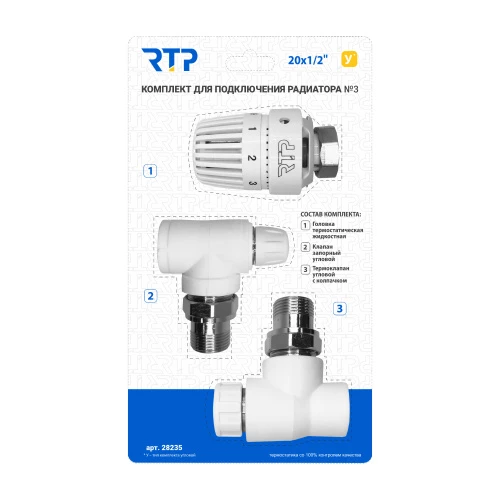 Комплект № 3 от RTP - это набор запорных клапанов и вентилей, предназначенных для использования в системах отопления. Комплект включает в себя два элемента: прямой запорный клапан и прямой вентиль. Оба компонента изготовлены из полипропилена, что обеспечивает их долговечность и устойчивость к высоким температурам.