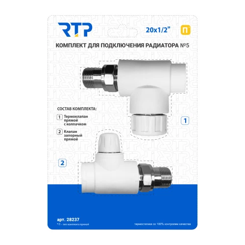 Комплект № 5 от RTP - это набор запорных клапанов и вентилей, предназначенных для использования в системах отопления. Комплект включает в себя два элемента: прямой запорный клапан и прямой вентиль. Оба компонента изготовлены из полипропилена, что обеспечивает их долговечность и устойчивость к высоким температурам.