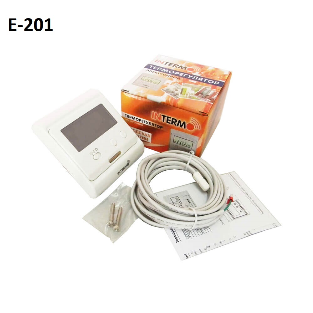 Intermo E-201 – это электронный терморегулятор для ручной и автоматической регулировки температуры в различных помещениях, обогреваемых кабельными, инфракрасными и другими электрическими системами обогрева.