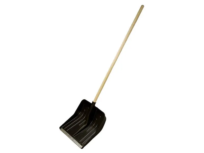 Снеговая лопата имеет удобный глубокий ковш из морозоустойчивого пластика. Рабочая кромка ковша дополнительно снабжена окантовкой из оцинкованной стали. Место соединения ковша с тулейкой усилено специальным ребром, позволяющим убирать тяжелый мокрый снег. Черенок выполнен из березы высшего сорта.