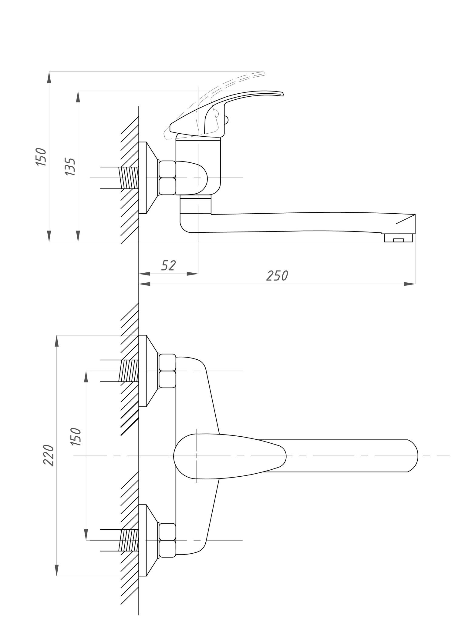 Такая модель подойдет для установки на стену над умывальником (мойкой), если набортное крепление по каким-либо причинам не возможно. Также настенный смеситель без душа может быть использован в тех случаях, когда душевой механизм не требуется.
