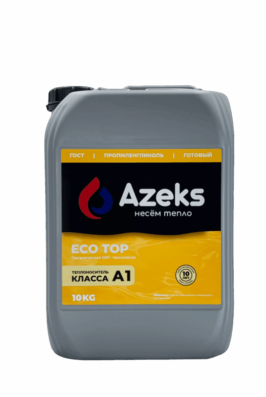 Теплоноситель AZEKS ECO TOP — готовый к использованию пропиленгликолевый раствор класса A1 с органической технологией OAT (Organic Acid Technology). Разработан по ГОСТ 3.344-2015 для надежной защиты систем отопления и охлаждения в жилых и промышленных зданиях. Особенно рекомендован для объектов с повышенными требованиями безопасности, включая пищевую промышленность.